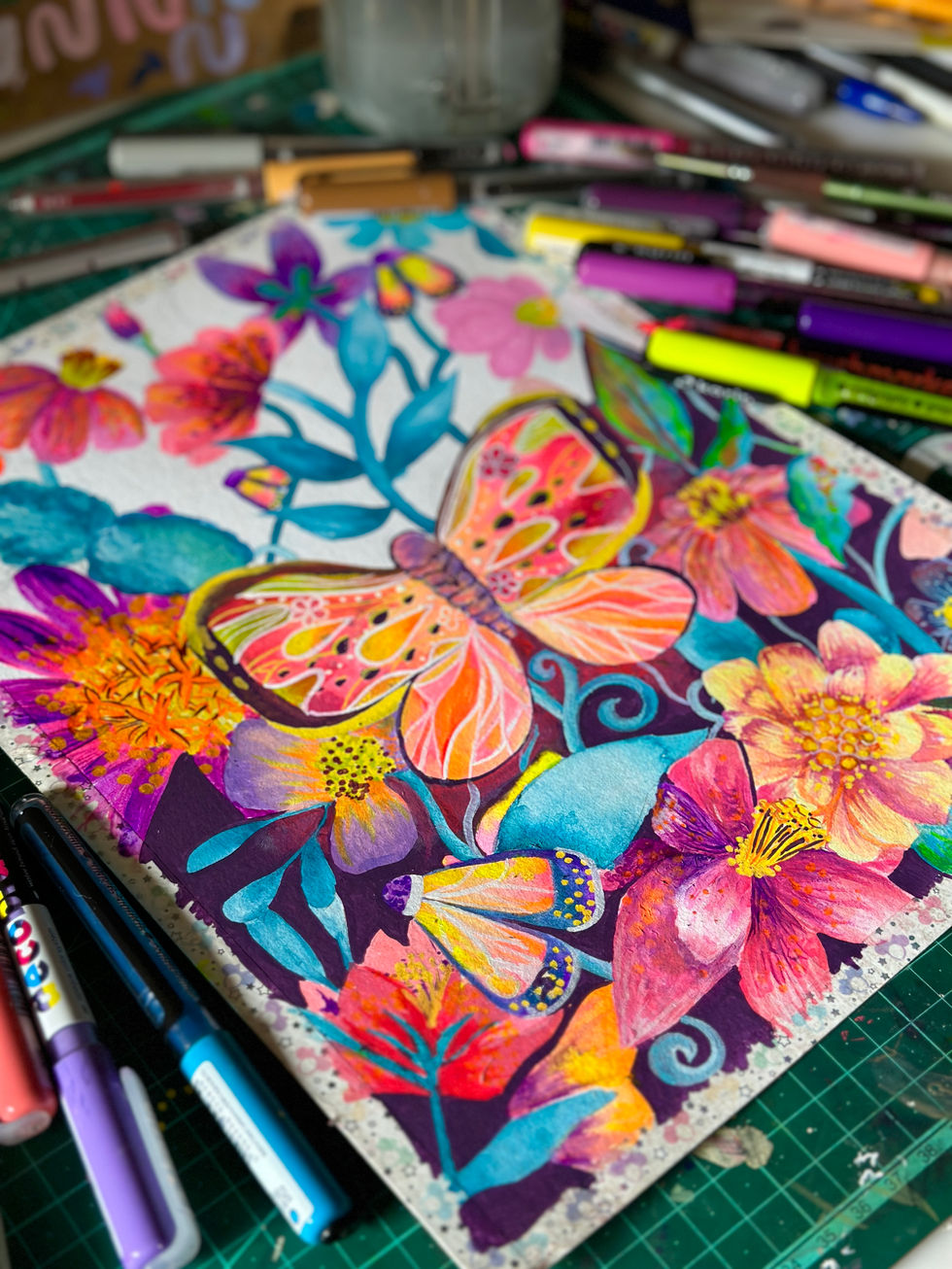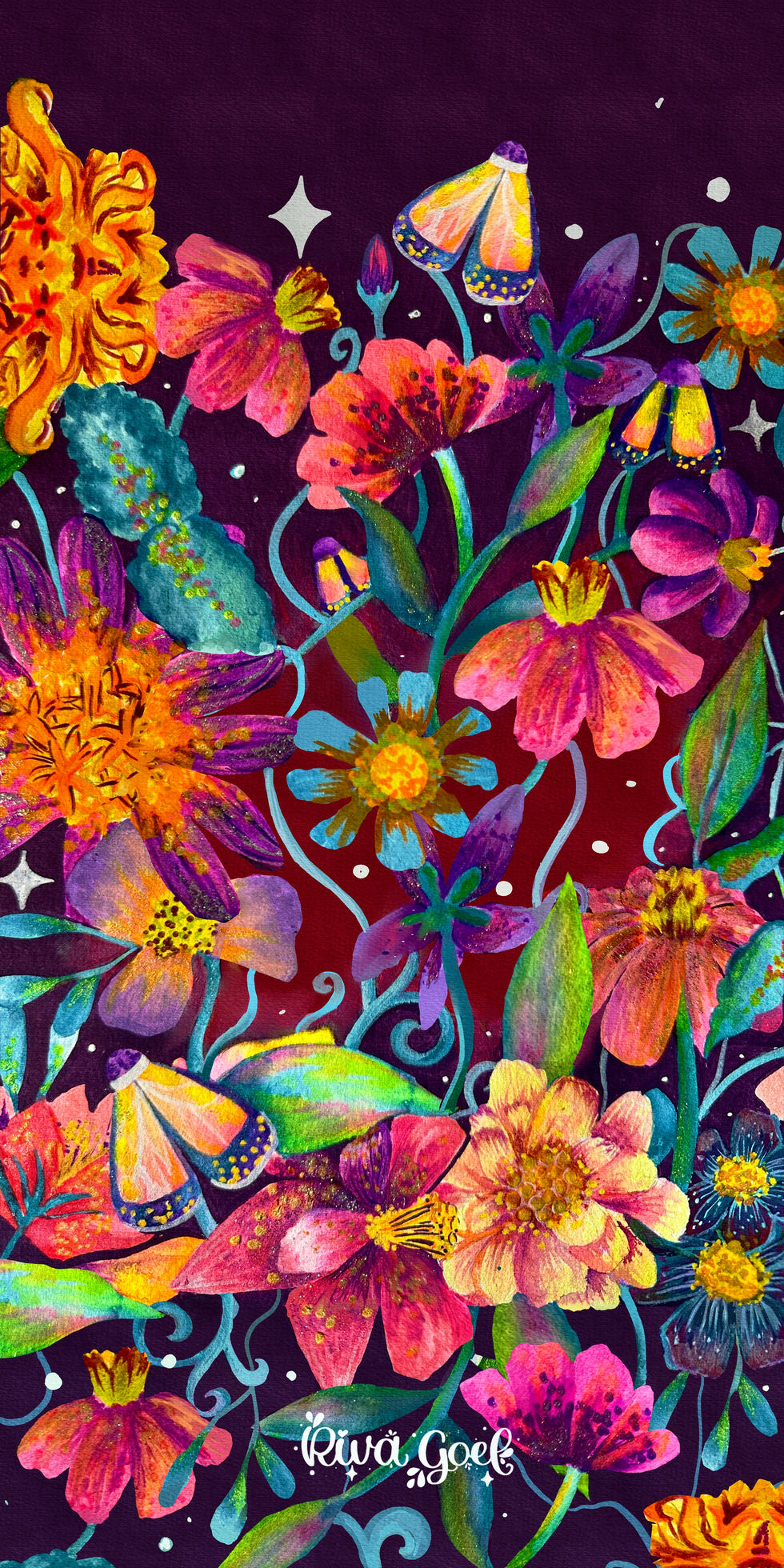 This illustration explores transformation, growth, and the quiet energy of nature through a vibrant, layered watercolor composition. Centered around a butterfly surrounded by dense floral forms, the piece celebrates metamorphosis as both a natural and personal process. I leaned into saturated color, decorative patterning, and organic linework, allowing intuition to guide the flow rather than strict realism. The deep background contrasts with luminous florals to create depth and movement, mirroring the feeling of life emerging from stillness. Working traditionally with watercolor allows me to embrace unpredictability and texture , qualities that continue to influence how I approach color, material, and storytelling in my digital and 3D work.